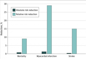 Meta-analyses showed reductions in the absolute risk of 0.8% (95% CI, 0.4%-1.2%) for all-cause mortality, 1.3% (95% CI, 0.9%-1.7%) for myocardial infarction, and 0.4% (95% CI, 0.2%-0.6%) for stroke in those randomized to treatment with statins,