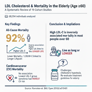 Comment: This study shows that in elderly patients, higher LDL/”bad” cholesterol is associated with longer lifespan. Summary: Clinical Bottom Line This systematic review presents a provocative challenge to the conventional cholesterol hypothesis. In an analysis of cohort studies including over 68,000 individuals older than 60, high low-density lipoprotein cholesterol (LDL-C) was not associated with increased […]