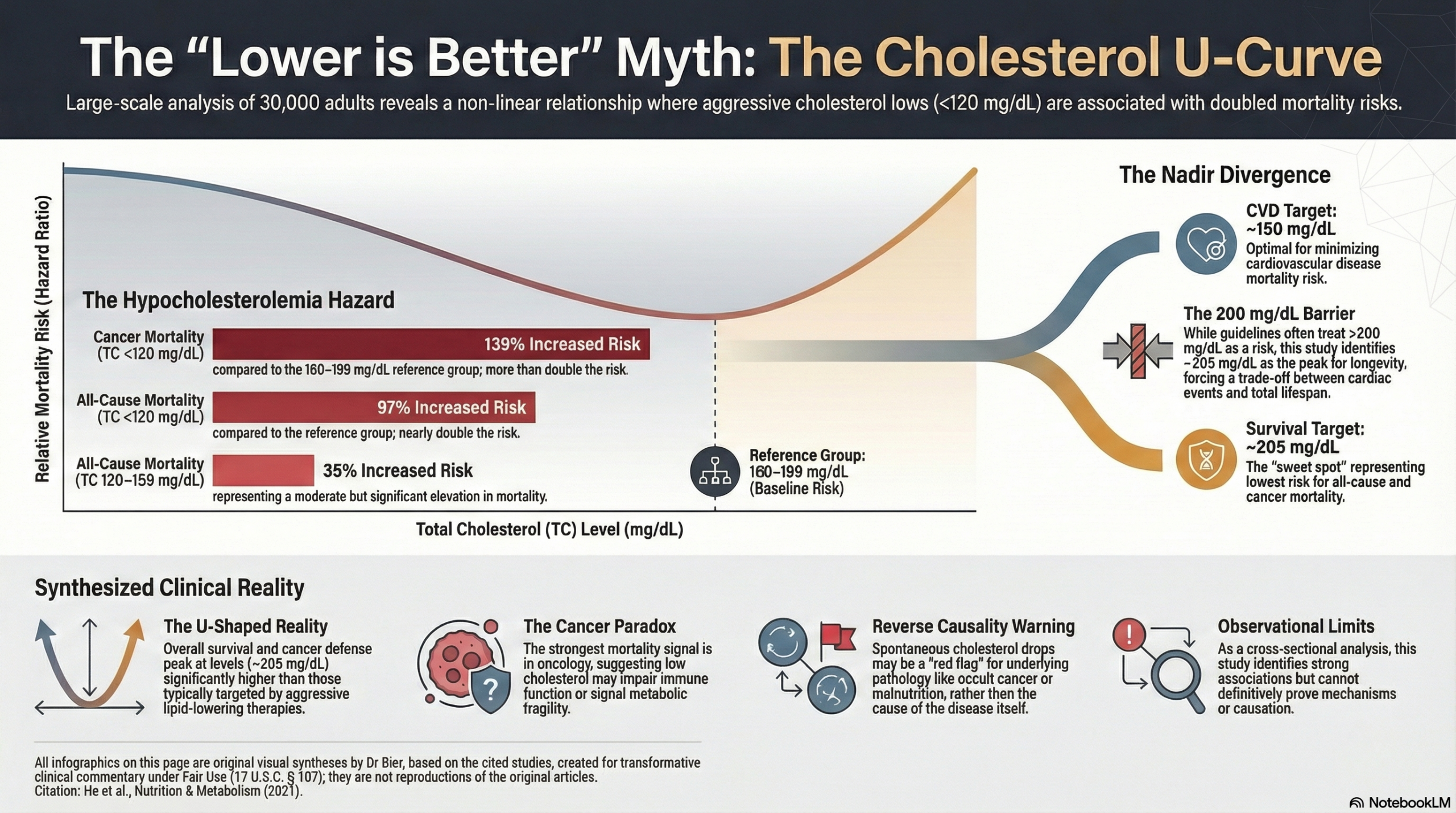 When defining “optimal” cholesterol we need to look at the whole person, not just for cardiovascular risk. The consistent signal linking ultra-low cholesterol to increased cancer and all-cause mortality suggests that we should treat these levels as a potential clinical warning sign rather than a metric of success. The burden of proof rests on aggressive interventions to demonstrate improved Overall Survival, not just a reduction in isolated disease-specific endpoints.