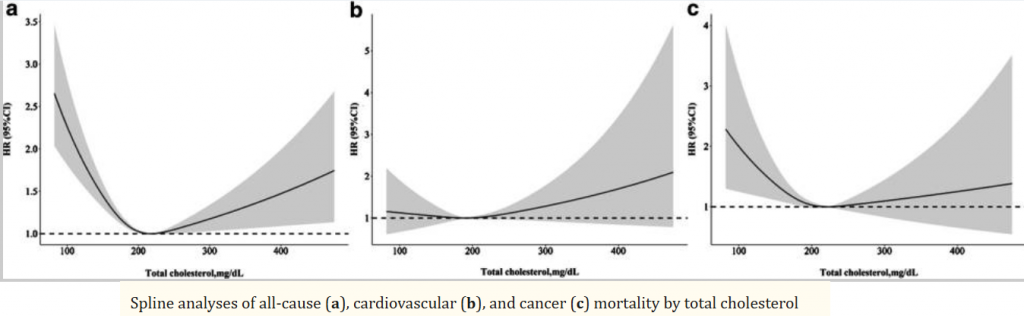 Another in a series of studies that contradicts the dogma that lower cholesterol is better. Although the authors calculated cut off points, using the spline graphs you can see that cholesterol up to about the 230 range is lowest risk of overall deaths and even 300 is better than 160. For cancer you’re safer at even higher levels.