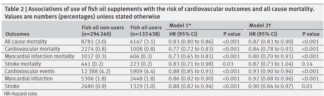 Main Results After adjusting for a wide range of demographic, lifestyle, and health-related factors, habitual users of fish oil supplements had a 13% lower rate of death from any cause compared to non-users over a median follow-up of 9.0 years.