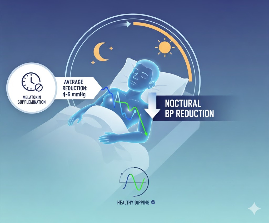Controlled-Release (CR) Melatonin: Significantly reduced both nocturnal systolic blood pressure (by -6.1 mmHg) and diastolic blood pressure (by -3.5 mmHg) compared to placebo.