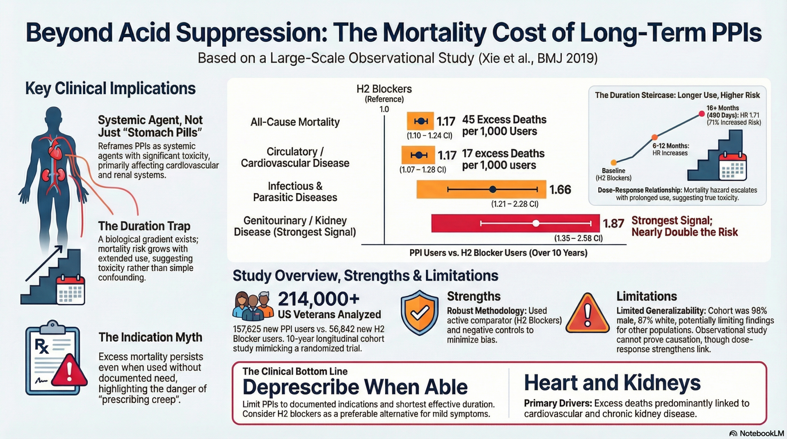 This large observational cohort study demonstrates a statistically significant association between new proton pump inhibitor (PPI) use and excess all-cause mortality compared to H2 blockers, specifically driven by cardiovascular disease, chronic kidney disease, and upper gastrointestinal cancer. While the study employs rigorous methods to minimize confounding (including active comparators and high-dimensional propensity scores), it remains observational and cannot definitively prove causation. However, the graded relationship between duration of use and mortality risk strongly supports the clinical imperative to deprescribe PPIs when they are no longer medically indicated, particularly in older adults.