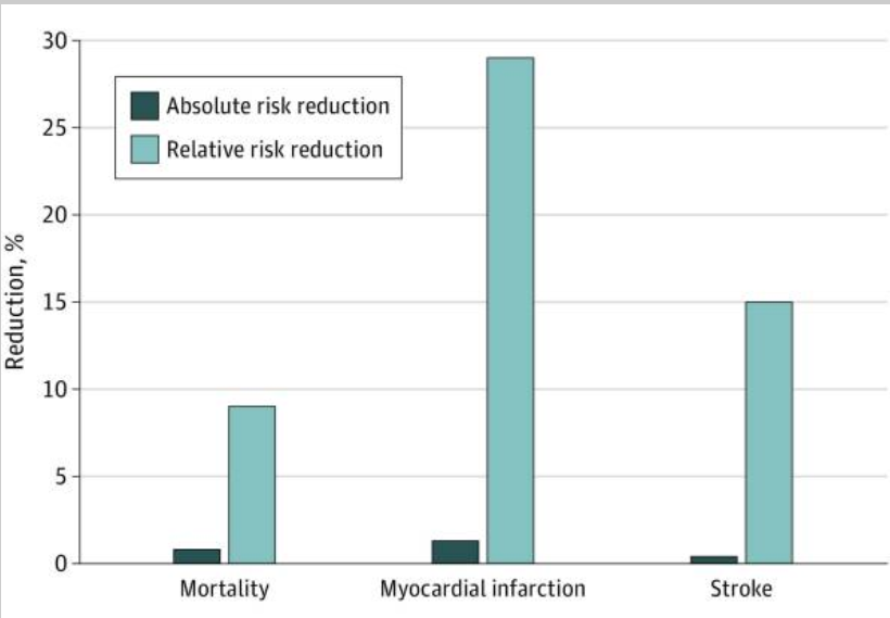 The meta-analysis pooled results from 21 trials and found the following effects for statin therapy compared to placebo or usual care: