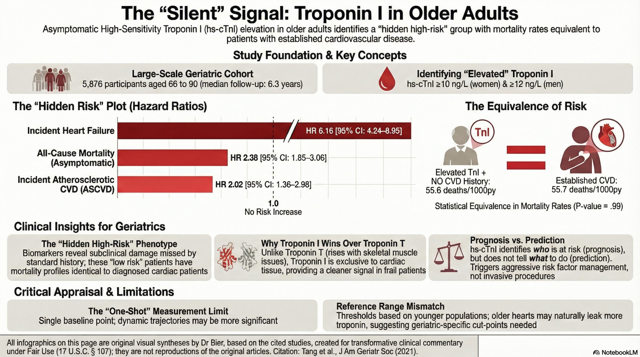 While hs-cTnI improves risk stratification beyond traditional factors (like cholesterol and blood pressure), clinicians must recognize that this study establishes prognosis (risk prediction), not prediction of treatment response. Elevated hs-cTnI identifies a vulnerable “hidden high-risk” geriatric population, particularly for future heart failure, but the study does not define a specific therapeutic algorithm for these patients beyond general intensive risk factor management.