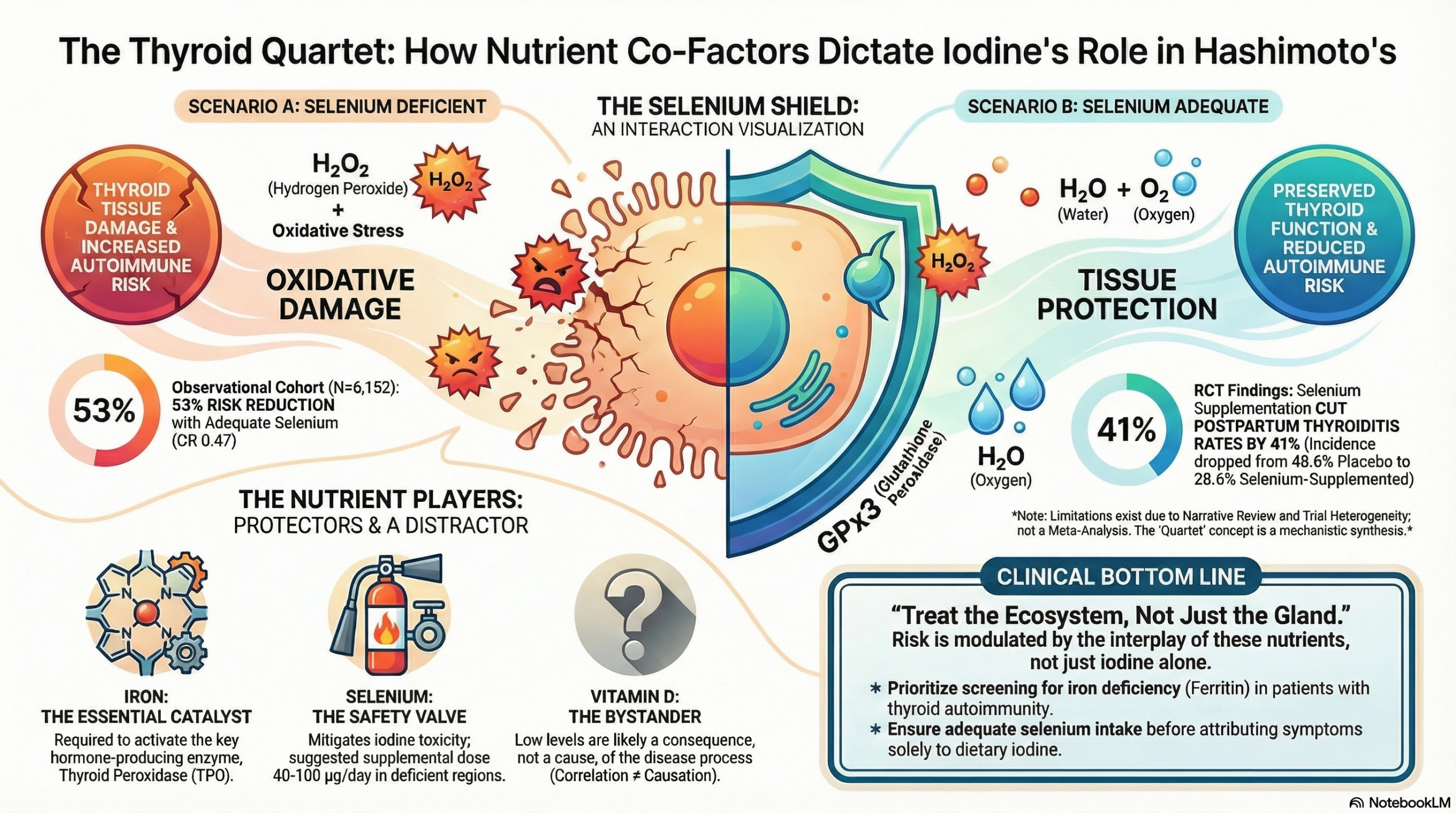 • Mechanism: Selenium is vital for glutathione peroxidases (e.g., GPx3), enzymes that protect thyrocytes by removing excessive hydrogen peroxide (H2O2) generated during thyroid hormone synthesis.