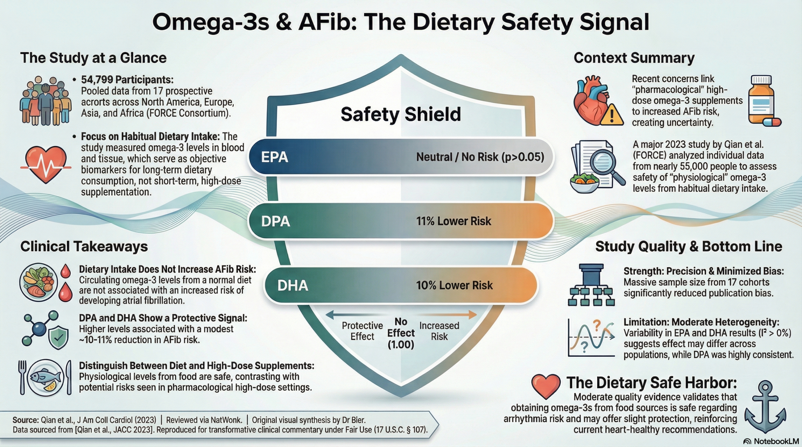 This analysis of 17 prospective cohorts demonstrates that higher circulating levels of DHA and DPA are associated with a significant reduction in incident atrial fibrillation, effectively rebutting the idea that Omega-3s are universally pro-arrhythmic. The tangible significance of this data is that it provides a clear signal that dietary fish consumption and physiological levels of these fatty acids remain clinically beneficial and safe.