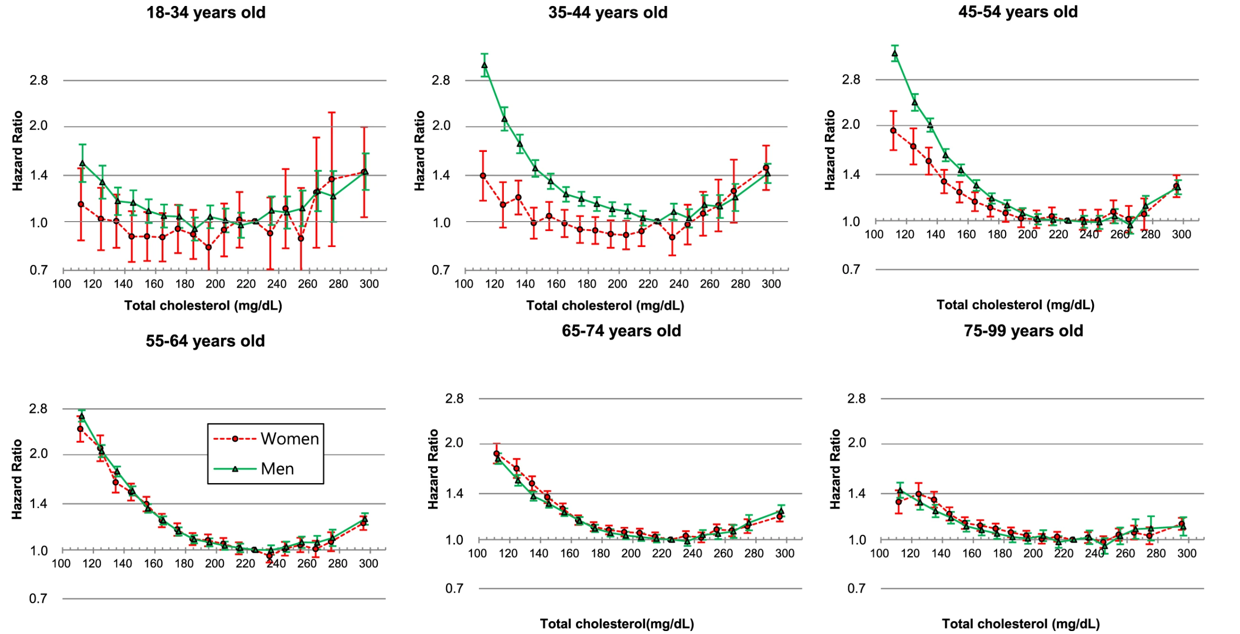 Another in a line of studies showing that our concept of cholesterol is wrong when it comes to the outcomes that matter. This one is particularly interesting as it breaks it down by age, showing that as we get older, higher cholesterol becomes more protective.