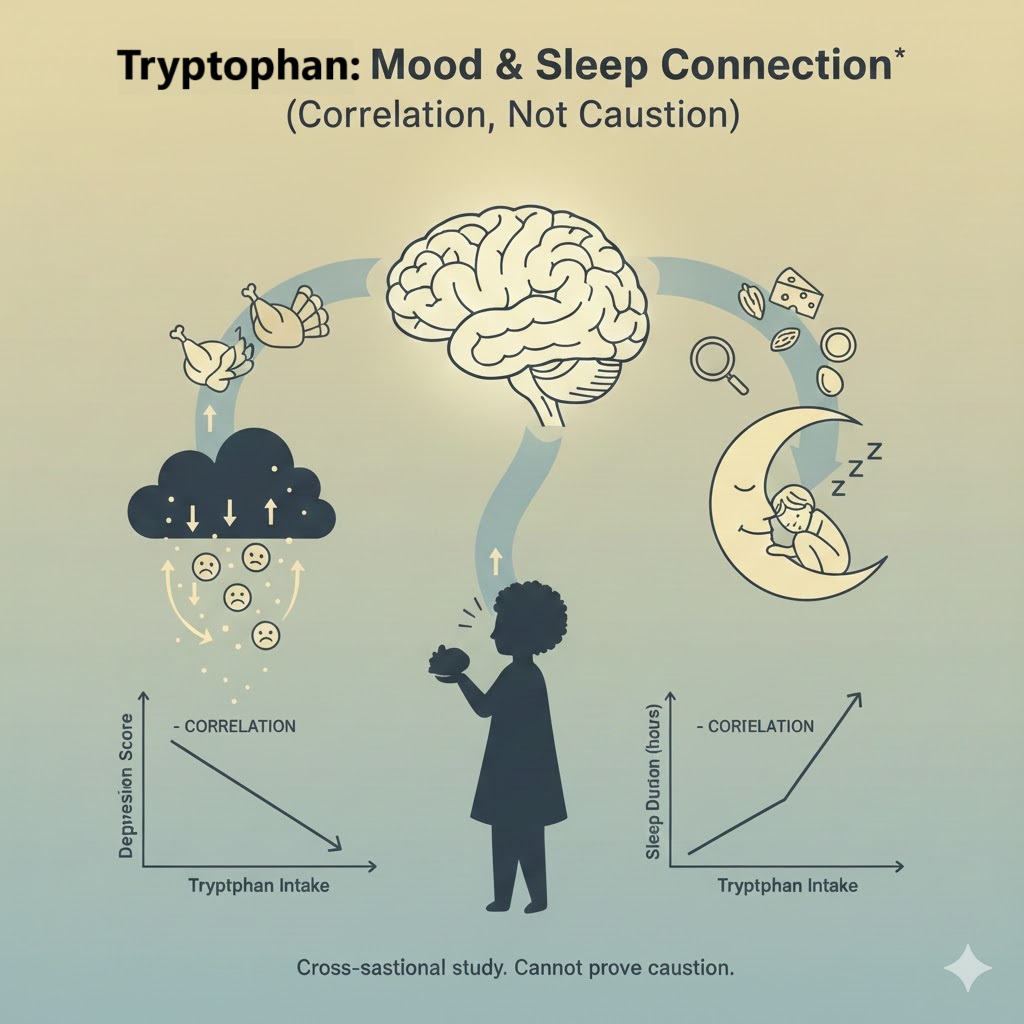 Clinicians should note that while this finding is biologically plausible (tryptophan is a precursor to serotonin and melatonin, which affect mood and sleep), the cross-sectional design prohibits concluding a cause-and-effect relationship. Higher tryptophan intake may simply be a marker for an overall healthier diet or lifestyle.